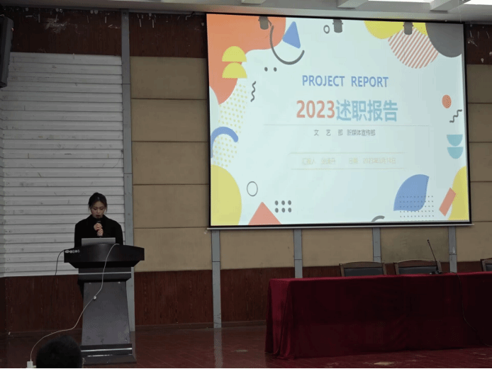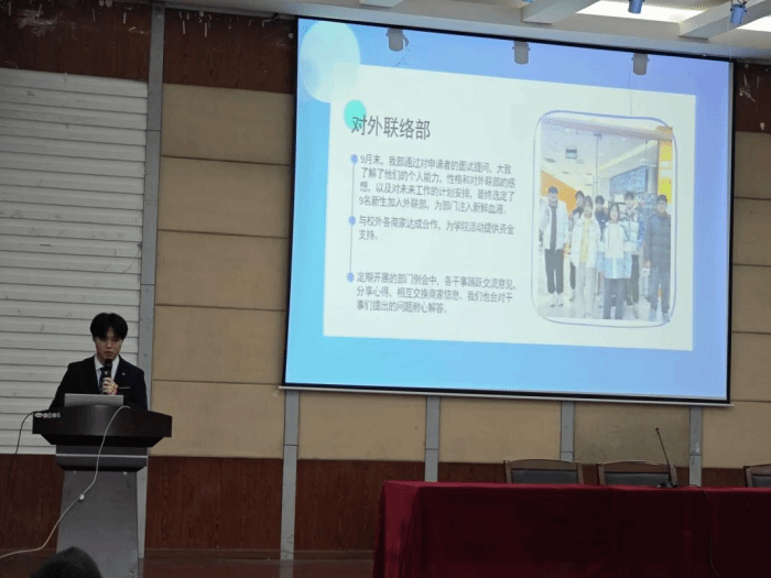 主席团成员依次上台,分别就各自职责范围内的工作进行了详细述职。他们通过PPT、视频等多种形式,展示了过去一年的工作成果,同时也客观地指出了存在的问题和不足,并对这一学期工作计划进行了展望。