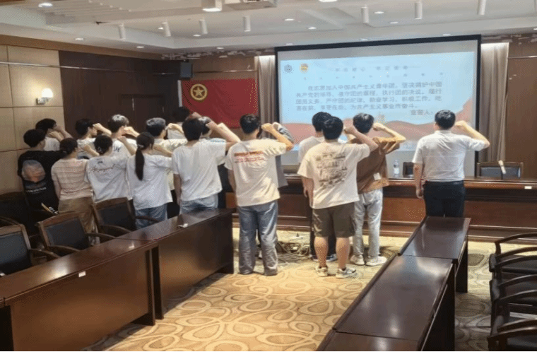 本次团课教育活动主要分为三个环节。第一个环节,王俊围绕“重温团的历史、学习团章做合格共青团员、发挥团员的带头模范作用、做一名优秀的共青团员”四个方面入手,进行基础入团知识内容学习,使新入团的同学对中国共产主义青年团有更加深刻的认知,领悟不同时期青年的不同使命,从而激励大家不断学习,提高个人素养。第二个环节,全体起立,奏唱国歌。第三个环节,新发展团员入团宣誓。面向团旗,由学生代表曹义领誓,新发展团员们右手握拳,高举过头,郑重宣誓:“我志愿加入中国共产主义青年团,坚决拥护中国共产党的领导……”。王俊对新团员的加入表示热烈的欢迎和衷心的祝贺,并强调了共青团在青年学生成长成才过程中的重要作用,鼓励新团员们要坚定理想信念、刻苦学习、勇于实践、敢于创新、乐于奉献,努力成为德智体美劳全面发展的社会主义建设者和接班人。
