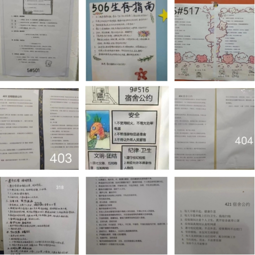 通过设立宿舍公约,解决生活中的小问题,可以使宿舍更文明,校园更温馨,同时也可以提高寝室生活质量,增强宿舍幸福感和凝聚力,提高宿舍成员的自觉性和自律性。此次活动要求各寝室成员共同商定、共同创作,共同制定寝室行为规范与学习、生活目标,短短两天时间里,大家相互探讨、分工合作,寝室成员分工明确,各司其职,共同为宿舍荣誉出谋划策。本次活动采用线上评比的方式进行,经过激烈角逐,材料学院5#604,5#611,12#223,12#224四个宿舍脱颖而出,荣获本次评比活动的一等奖宿舍。5#413,5#513,9#305,9#405,12#214,12#218获得二等奖宿舍,5#501,5#506,5#517,9#403,9#404,12#217,12#222,12#312,12#313获得三等奖宿舍,其余参与宿舍均获得优秀宿舍称号。