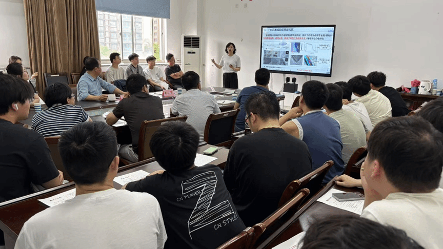 黄小萧教授以“吸波材料中的界面极化损耗机制研究”为题,介绍了电磁波吸收材料的研究背景,重点阐述了界面结构设计对吸波性能的影响、界面极化损耗的理论模型与实验验证方法等关键科学问题的最新研究进展。最后,参会师生就吸波材料的设计、界面极化特征的关键表征技术及优化设计策略等问题与黄小萧教授展开了深入的交流和讨论。
