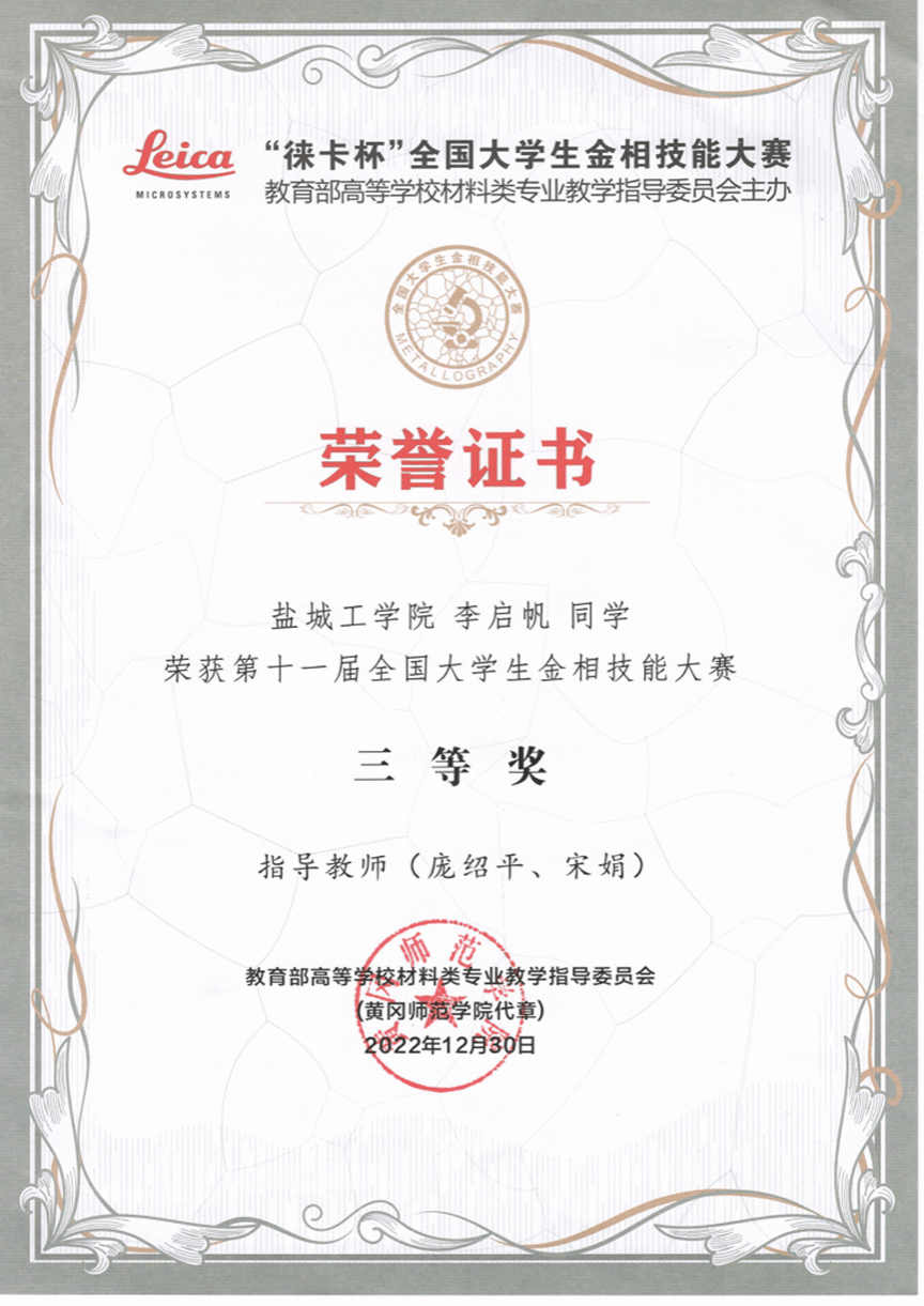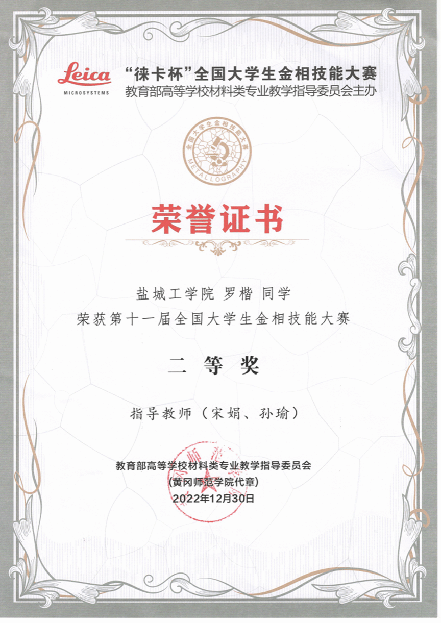 近日,第十一届全国大学生金相技能大赛结果公布,我院参赛队伍由孙瑜、庞绍平、宋娟三位老师指导,分别获得一等奖1项(学生:杨馨悦),二等奖2项(学生:李家顺、罗楷),三等奖1项(学生:李启帆)。至此,我院学生连续八年获得该赛事一等奖。