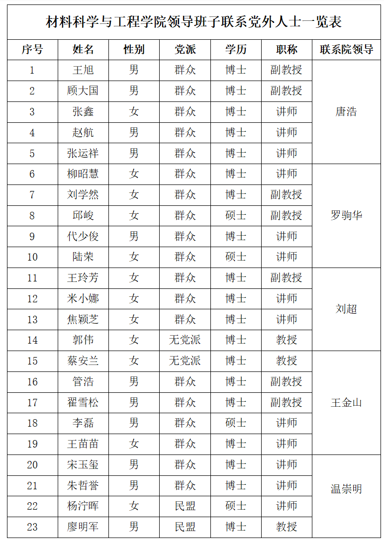 材料科学与工程学院领导班子联系党外人士一览表