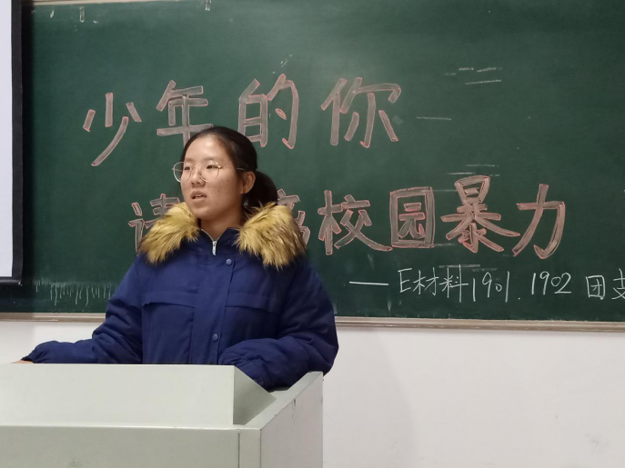 2019年11月28日下午四点,盐城工学院材料科学与工程学院E材料1901、1902团支部在博雅楼304举办了以校园暴力为主题的团日活动。由两个班的团支书王璐同学和雪知媛同学主持本次活动,通过系列活动向同学们介绍有关校园暴力的知识,增强同学们的自我防护意识,提高法律素养。