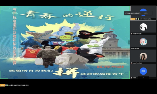 2020年5月10日,我院举办的“学习援鄂精神,为抗疫最美逆行者喝彩”五四线上云朗诵大赛完美落幕。本次活动形式新颖,经过各班初选赛后,36名同学进入决赛,全程采用网络直播形式,“云上”面对面,“云上”共朗诵,旨在以淳朴的语言歌颂抗击疫情的英雄,用青春的声音表达崇高的敬意。