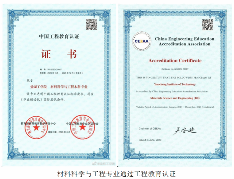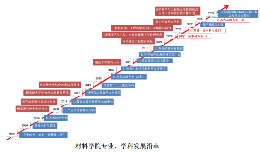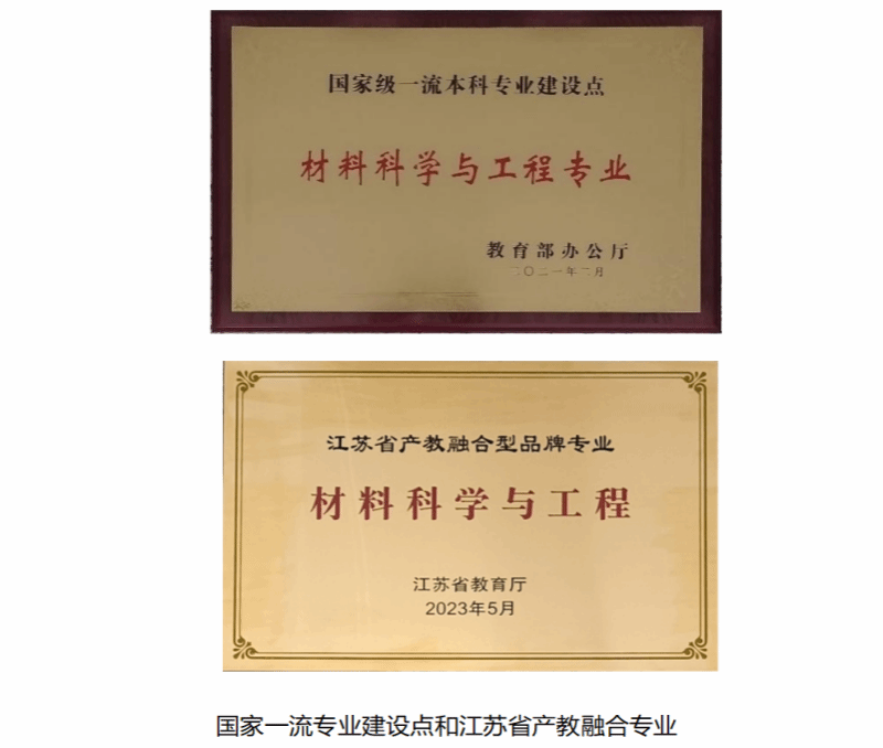 2019年材料科学与工程专业获批江苏省一流本科专业建设项目,2020年材料科学与工程专业通过中国工程教育专业认证协会专业认证复评。2021年获批材料科学与工程一级学科硕士学位授权点和交通运输专业学位授权点,材料科学与工程专业获批国家一流本科专业建设点和江苏省高校品牌专业建设工程二期项目(省品牌专业)。2022年材料科学与工程学科获批“十四五”江苏省重点学科(B类),高分子材料与工程专业、新能源材料与器件专业获批江苏省一流本科专业建设点和江苏省高校品牌专业建设工程二期项目(省特色专业),高分子材料与工程推荐申报国家级一流本科专业建设点。2023年材料科学与工程专业获批江苏省产教融合型品牌专业建设点,新专业材料化学通过教育部审批。2023年材料科学与工程专业获批省级产教融合专业。2024年材料科学与工程专业获批江苏省高校品牌专业建设工程三期项目(省品牌专业),纳米科学与工程一级学科硕士学位授权点通过教育部审批。2025年材料科学学科进入ESI全球排名前0.492%。