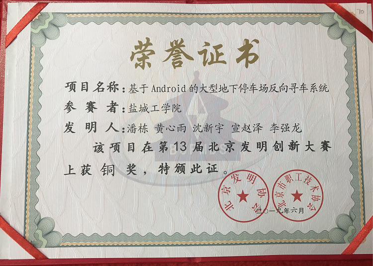经过激烈角逐,UED体育交通工程系钟栋青、廖明军、韦凌翔三位老师共同指导,潘栋、黄心雨、沈新宇、宣赵泽、李强龙等学生完成的作品《基于Android的大型地下停车场反向寻车系统》获得铜奖。