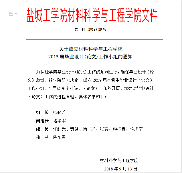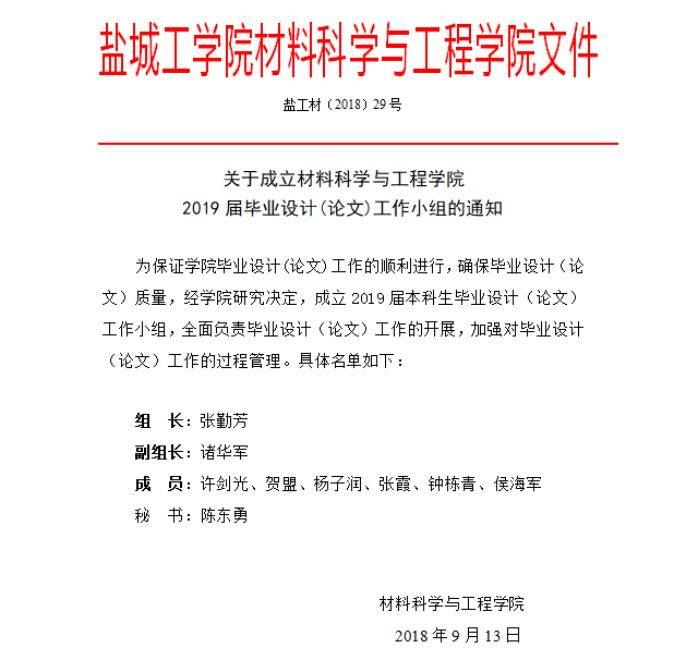 关于成立材料科学与工程学院2019届毕业设计(论文)工作小组的通知