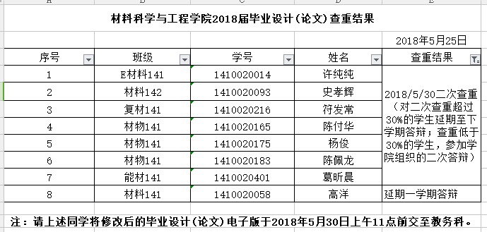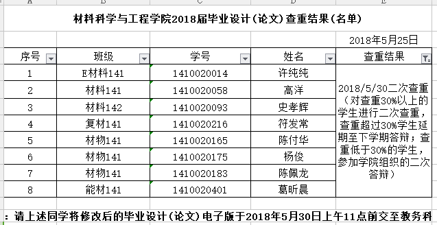 根据《材料科学与工程学院2018届毕业设计(论文)答辩及相关工作安排》,现公布材料科学与工程学院学院2018届毕业设计(论文)查重结果,具体见附件。