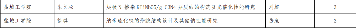 在2019 年江苏省普通高校本科优秀毕业设计(论文)评选中,刘超老师指导的毕业论文《层状 N-掺杂 KTiNbO5/g-C3N4 异质结的构筑及光催化性能研究》(学生:材料153 朱义松)、岳鹿老师指导的《纳米硫化铁的形貌结构设计及其储钠性能研究》(学生:材物151徐琪)分别获得三等奖。