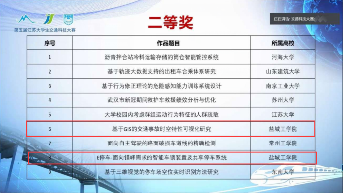 11月7日,第五届江苏省大学生交通科技大赛在南京工业大学江浦校区落下帷幕。我院学生共有四项作品获奖,《E停车-面向错峰需求的智能车锁装置及共享停车系统》、《基于GIS的交通事故时空特性可视化研究》分别获得二等奖;《信号控制交叉口左转电动自行车交通流特性分析》、《基于ZigBee和RFID的车辆防追尾预警系统》分别获得优胜奖。