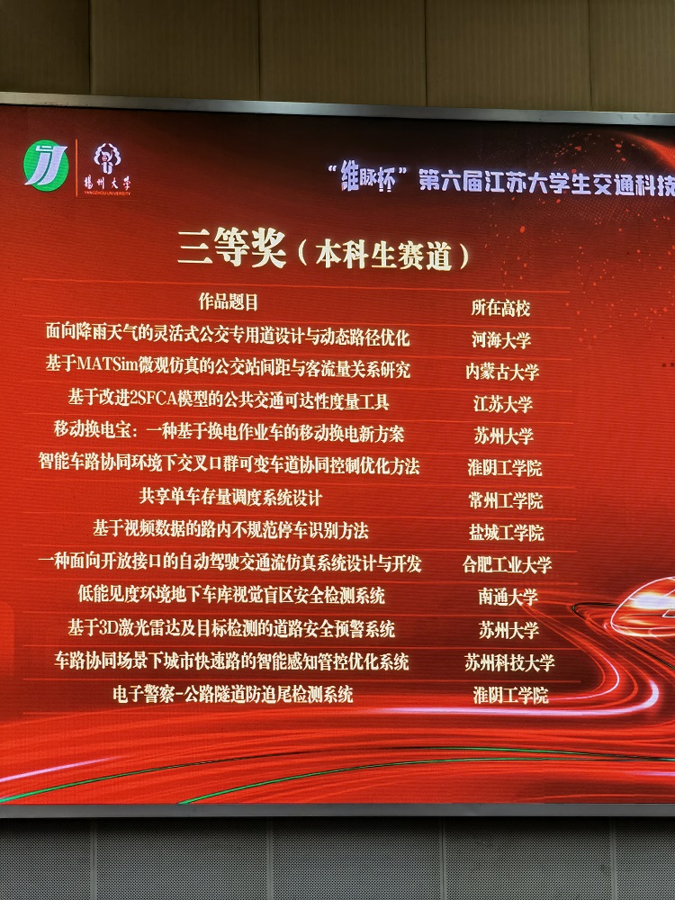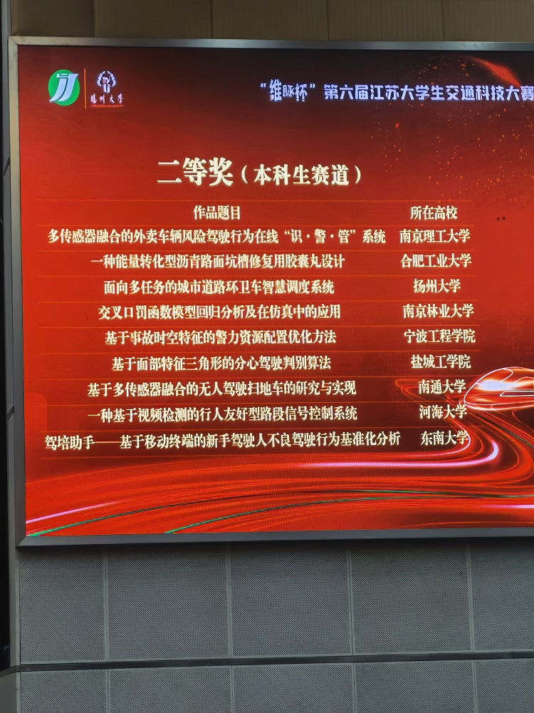 7月9日至11日,第六届江苏省大学生交通科技大赛在扬州大学举办,我校UED体育交通工程系钟栋青、杜建周老师指导,UED体育刘宇轩、王磊、殷王宇、宋亚静、姬玉川等同学完成的作品《基于面部特征三角形的分心驾驶判别算法》获得二等奖,韦凌翔、钟栋青老师指导,UED体育孔龙龙、胡莹莹、陈慧娴、赵洪旭、胡化鹏等同学完成的作品《基于视频数据的路内不规范停车识别方法》获得三等奖。