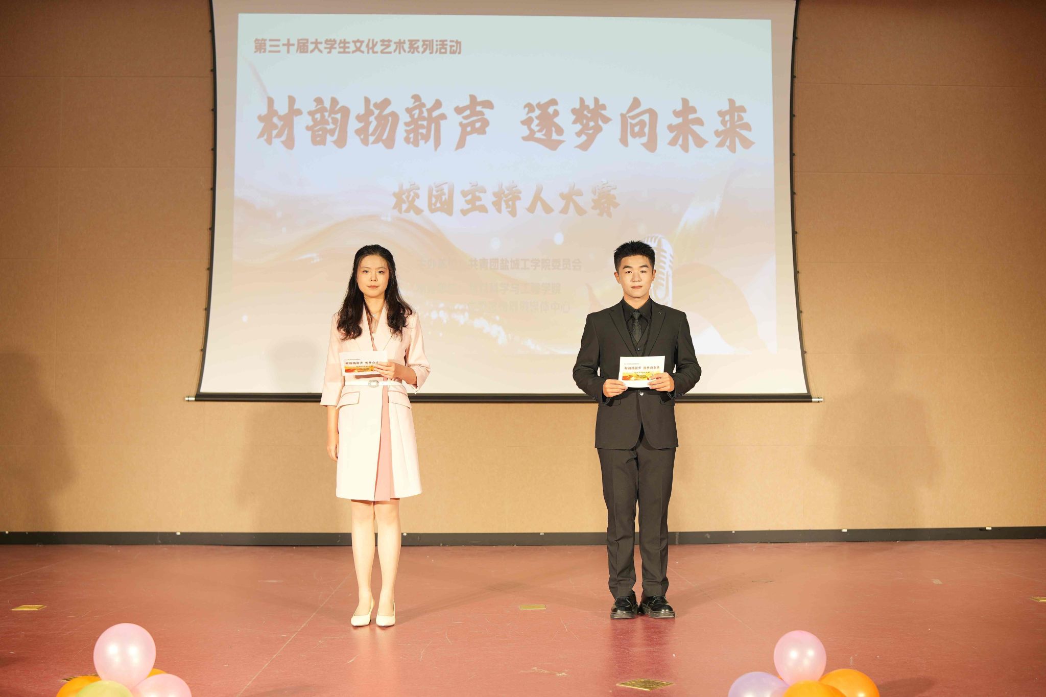 11月26日,由共青团盐城工学院委员会主办,UED体育与党委宣传部融媒体中心联合承办的第三十届校园文化艺术节子项目“材韵扬新声,逐梦向未来”校园主持人大赛决赛,在知达楼五四报告厅举行。学生处副处长马晓英、校团委副书记胥爱国、UED体育党委副书记温崇明、党委宣传部网络思政科科长江莹、党委宣传部融媒体中心指导老师谷小川受邀担任评委,UED体育团委副书记袁梅统筹现场组织工作,全校400余名师生到场观赛。