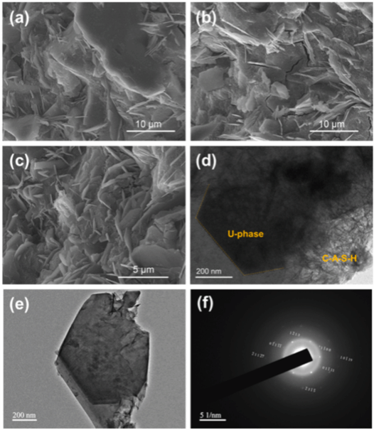碱激发矿渣(AAS)作为一种低碳水泥基材料,受到国内外学者及工业界广泛关注。此胶凝材料虽具备快硬早强、致密抗渗和抗化学侵蚀等优异特性,但工程化应用过程中仍面临体积安定性问题。为抑制AAS的高收缩特性,高璇老师联合山东大学庄培芝教授和同济大学张祖华教授提出了物相设计理念,指出胶凝材料中缺乏足够结晶相是导致AAS体积安定性较差的主因之一,而促进并控制AAS中结晶相生成是改善体积稳定性、抑制自收缩的新途径。基于此,本研究使用钠法脱硫灰和电石渣作为复合固体激发剂制备单组分AAS,促进AAS中含钠AFm型结晶相(U相)生成,利用其结晶膨胀性补偿早期自收缩,并系统表征了反应动力学、物相组成、孔隙结构及微观结构演变,揭示了AAS中U相生成及补偿收缩的行为机制。