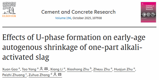 近日,我校材料科学与工程学院高璇老师在建筑材料领域顶级期刊Cement and Concrete Research(中科院一区TOP,影响因子10.9)上发表题为“Effects of U-phase formation on early-age autogenous shrinkage of one-part alkali-activated slag”的研究论文(DOI: 10.1016/j.cemconres.2025.107938),盐城工学院为第一单位,杨涛副教授为论文的通讯作者,盐城工学院绿色建筑材料研究所朱哲誉老师和诸华军教授为相关研究工作提供了重要指导。