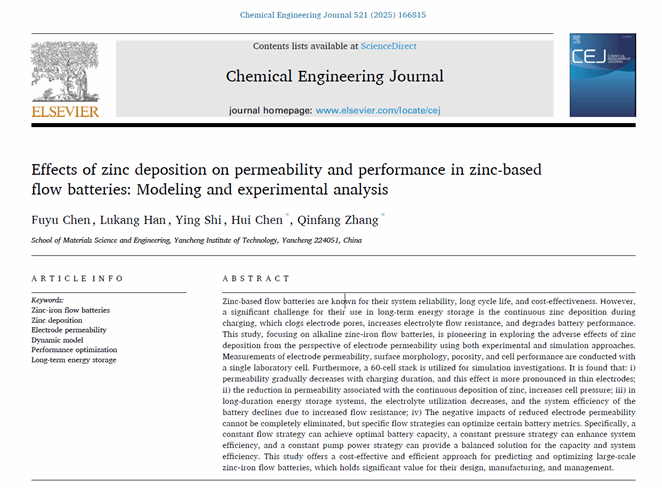 近日,UED体育陈富于博士的研究论文《Effects of zinc deposition on permeability and performance in zinc-based flow batteries: Modeling and experimental analysis》(Chem. Eng. J., 521(2025) 166815)发表于《Chemical Engineering Journal》( IF=13.2)。陈富于为第一作者,陈晖副教授和张勤芳教授为通讯作者,盐城工学院为唯一单位。