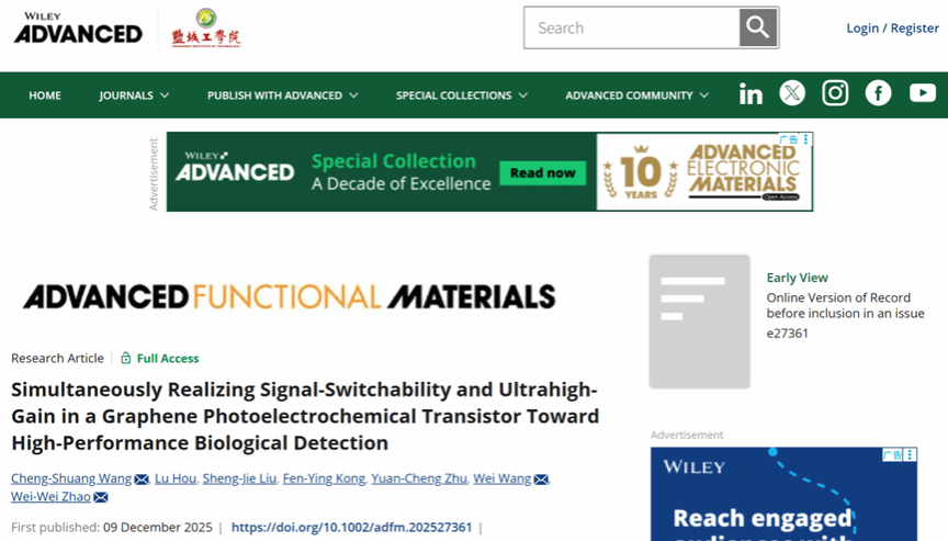 近日,UED体育王成双和王伟教授联合南京大学赵伟伟教授在材料领域国际顶级期刊《Advanced Functional Materials》(中科院一区Top,影响因子19)上发表题为“Simultaneously Realizing Signal-Switchability and Ultrahigh-Gain in a Graphene Photoelectrochemical Transistor Toward High-Performance Biological Detection”的研究论文(DOI: 10.1002/adfm.202527361),盐城工学院为第一署名单位,第一/通讯作者王成双教授指导硕士研究生完成实验设计、结果分析及论文撰写,通讯作者王伟教授负责研究方案指导、结果分析和论文润色,通讯作者南京大学赵伟伟教授负责晶体管制备、实际样品检测及论文润色。本研究得到了盐城工学院和江苏省高校“青蓝工程”中青年学术带头人等项目经费的支持。