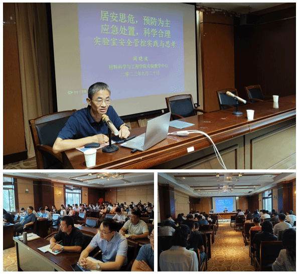 为进一步强化我院师生的实验室安全意识,扎实做好实验室安全工作,保障广大师生人身安全,切实维护学校安全稳定。9月20日下午,我院邀请材料实验中心阎晓波老师,为我院教师开展实验室安全知识讲座。UED体育党委书记唐浩、副院长罗驹华(主持工作)、副院长诸华军、副书记朱凌、全体教职工参加本次活动。