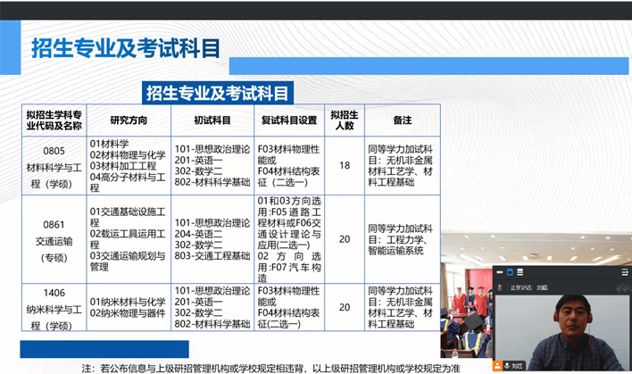刘超介绍了学校和学院概况、学科建设、师资力量、教学实验设施以及科研成果,着重阐述了学院的学术交流情况、专业特色与优势、培养机制等。瞿建详细解读了学校招生政策及形式、报考条件、各科目考纲、考试要求以及研究生奖助体系,分享了优秀毕业生的典型事迹,解答了考生关于报考方式、报考条件、培养方式、招生专业及计划等关心的问题。